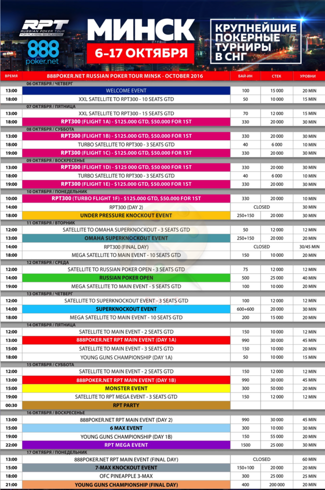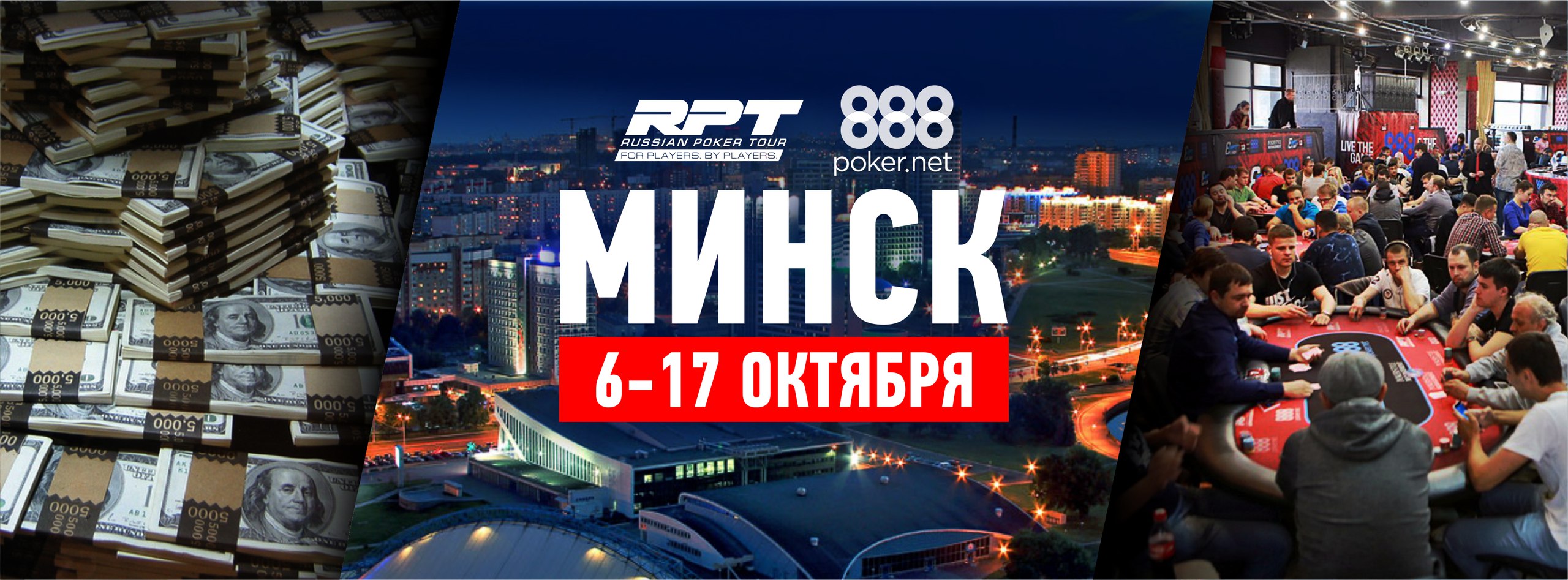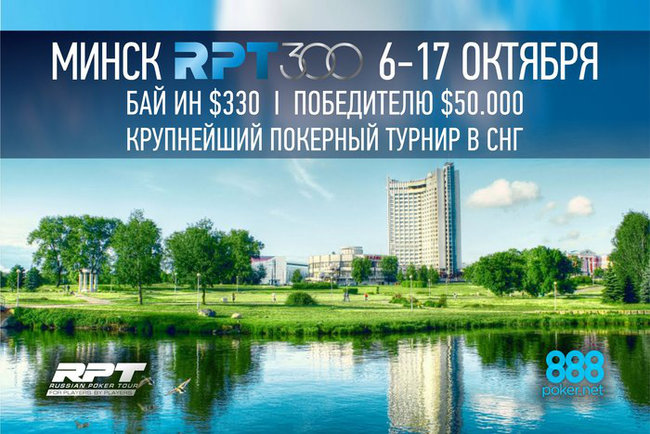 Турниры традиционно пройдут в казино «Эмир» — с 6 по 17 октября. На этот раз Russian Poker Tour ожидает больше игроков, чем обычно. Во-первых, потому, что прошло достаточно времени после последнего этапа RPT (он также проводился в Минске), и поклонники покера успели соскучиться по игре. Во-вторых, октябрь считается наиболее популярным месяцем для турниров по покеру, после летних, конечно. Что немаловажно, в это время не проводятся игры международного уровня. И еще одна веская причина, чтобы ожидать множество гостей на турнирах серии: сателлиты на 888poker, умноженные на два. Ведь грядущий этап пройдет при поддержке 888poker – а это значимая фигура в мире онлайн покера. Ну и сам город Минск гарантирует уйму развлечений наряду с традиционным гостеприимством.